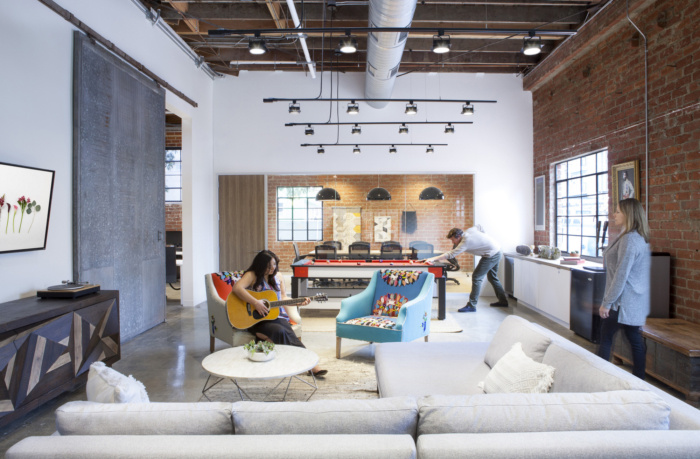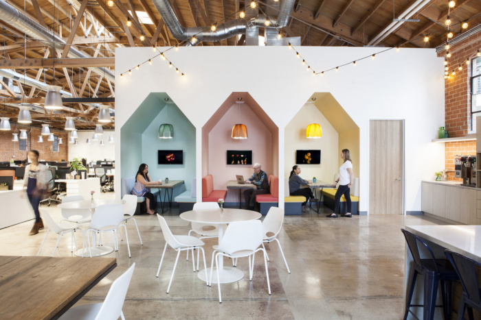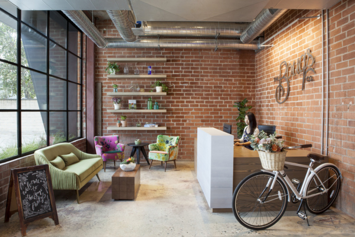 鲜花散落各处,从字面上和比喻上都有体现:前台的枝形吊灯投射出花卉的阴影,具有解释性,而花卉图案的瓷砖等精致细节则更具字面意义。最终结果是为公司员工提供了一个有趣的新鲜绿洲;一种感觉开放和诱人的花卉服装。#佛山办公室装修案例#