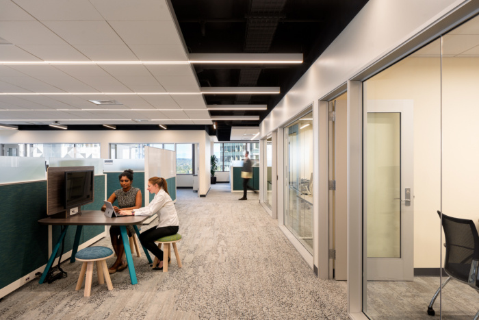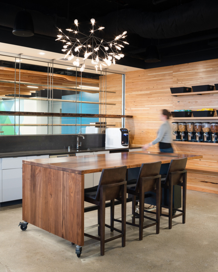 为了重新连接办公空间,重新设计了一个现有的、没有吸引力的分隔楼层的楼梯。木质元素沿着循环路径流动,并通过楼梯连接到上面的地板。木材被回收利用,这支持了客户对可持续性的承诺以及华盛顿州在木材生产方面的重要历史。#办公室装修设计公司#