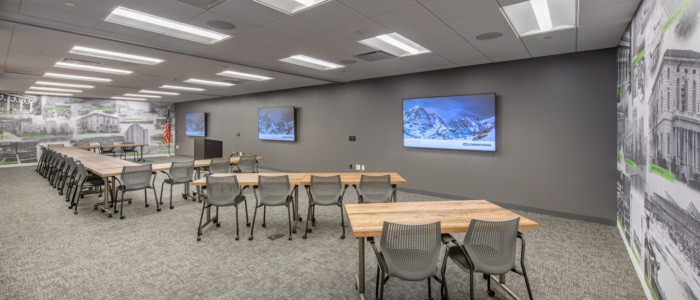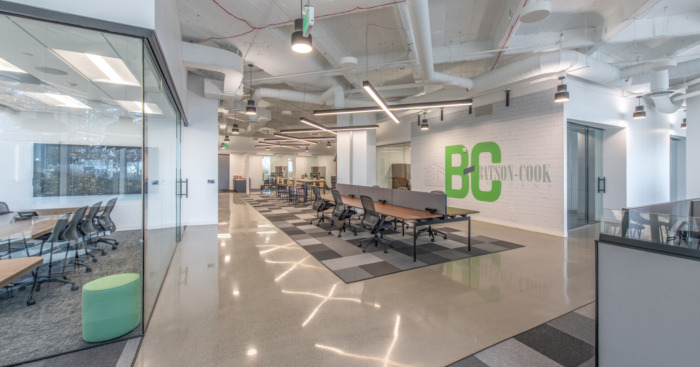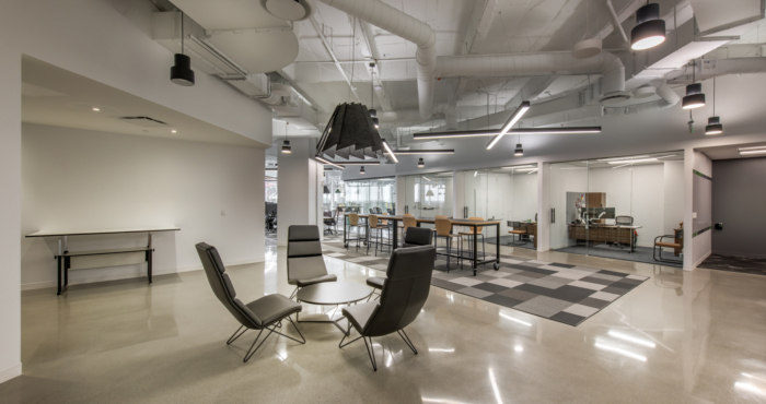 建筑材料、木材、钢材和玻璃在设计中得到了体现,以帮助讲述企业的品牌故事,结合品牌设计,专注于关系、信任和“他们的人”。#办公空间设计装修公司#