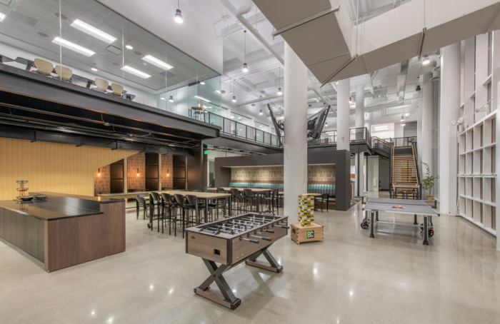 添加一个新的夹层是设计的一个关键元素,最大限度地利用空间的高度,并使设计与暴露的钢元素和新楼梯结合在一起。休息室被设计成一个中央社区空间,通过一扇新的双折叠门将人们与户外连接起来,让空间可以呼吸并作为活动空间。#办公空间设计装修案例#
