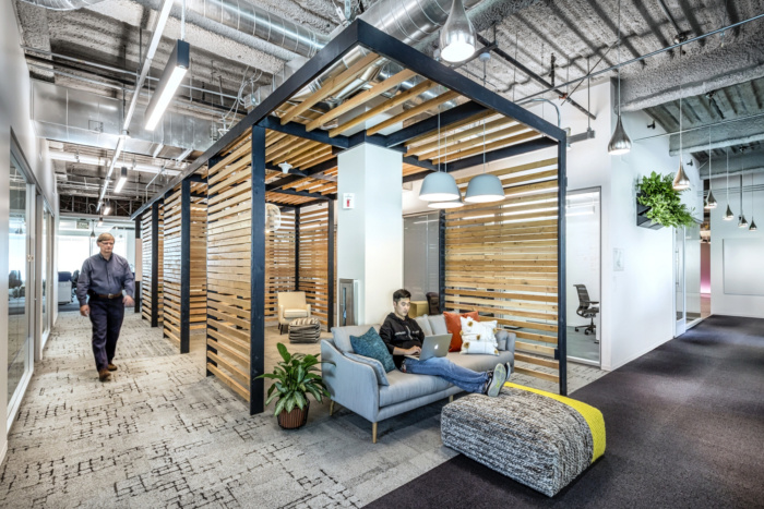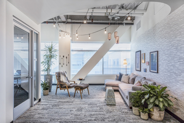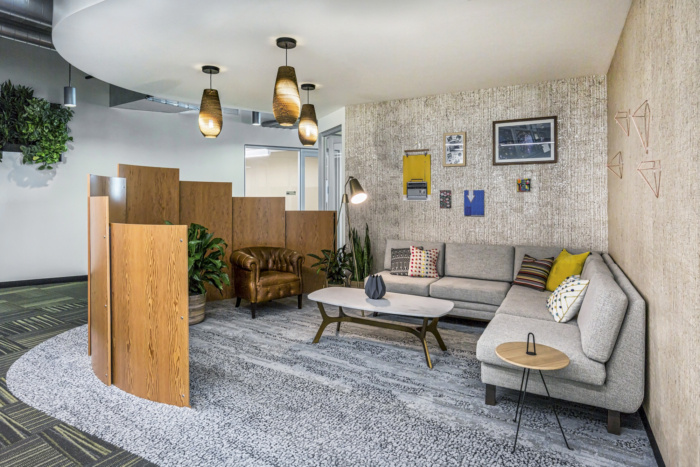 纹理、家具和照明的选择为每个协作区域提供了独特的身份。设计团队用精心策划的装饰和照明设备将空间分层,以俏皮地增强每个区域的独特品质。各种复古风格的家具和住宅元素——如迷你酒吧、框架艺术品和地毯——增添了温暖。座椅组件,例如用于专注工作的舒适摇椅、用于协作头脑风暴的客厅沙发以及内置在休闲长椅中,让您远离典型的工作场所。集成的白板表面允许员工利用休息室进行各种工作。五颜六色的背光隔断作为搁架和座位区的背景。#专业办公室装修公司#