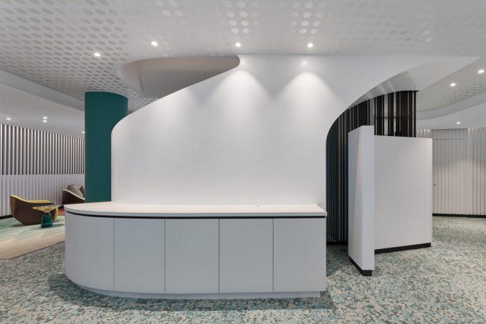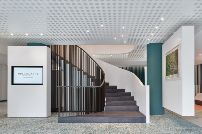 自由流动的开放楼梯邀请您踏上旅程:从现在和未来到未来,从公众到谨慎,从日常生活的混乱到法律段落的秩序,它以相应的雕塑姿态打开,指示通往工作场所的道路。从休息室到自助餐厅,各种各样的开放式和封闭式会议选项为各种情况提供了合适的环境。#高端办公室装修设计#