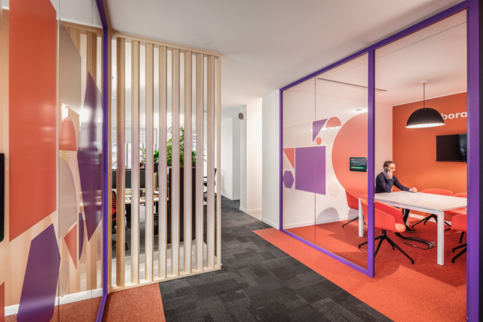 设计的关键也是客户要求将集团的品牌标识整合到空间中,用于窗户、窗户贴花和地毯,颜色与非常明亮的红色和紫色色调的组合在视觉上让人想起调色板公司标志。#公司新办公室装修效果#