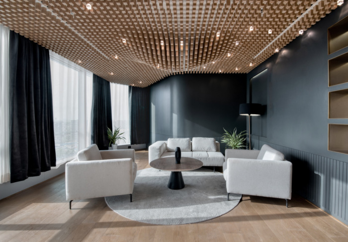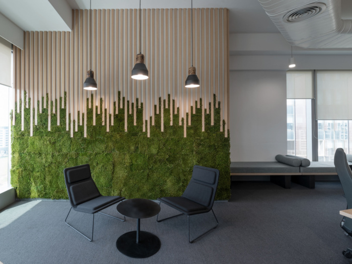 微妙的灰色和白色氛围,绿色的存在给工作站区域带来清新和现代的感觉。用作工作灯的木材材料与桌子对齐以产生平静的效果,这也是明亮、自然和舒适的。小屋在用于转化为正式外观和感觉的材料方面遵循相同的语言。有机和抽象元素、从意大利引进的保存植物、小屋和走廊的玻璃玻璃以及自助餐厅的柔软弧形座椅,所有这些都融合成一个协调但不同解释的设计,将内部与外部联系起来。#办公室设计装修效果#