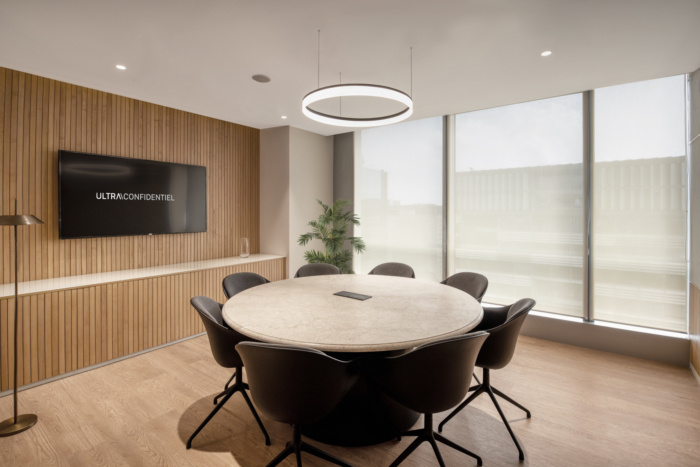 木制挡板的整个奢华印象从接待区传递到主席办公室,整体效果在墙壁上被放大和突出,使用高端材料,如皮革、大理石、黄铜和木地板。同样,董事会会议室的大桌子形成了房间里所有人的目光,其镶嵌在大理石上的黄铜作品复制了一件引起主席家人注意的艺术品。#办公室设计装修#