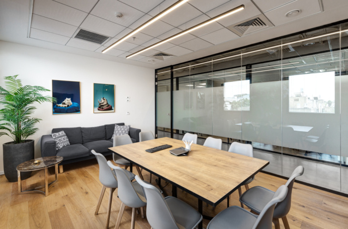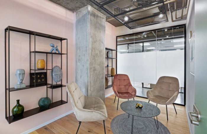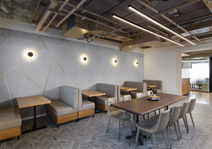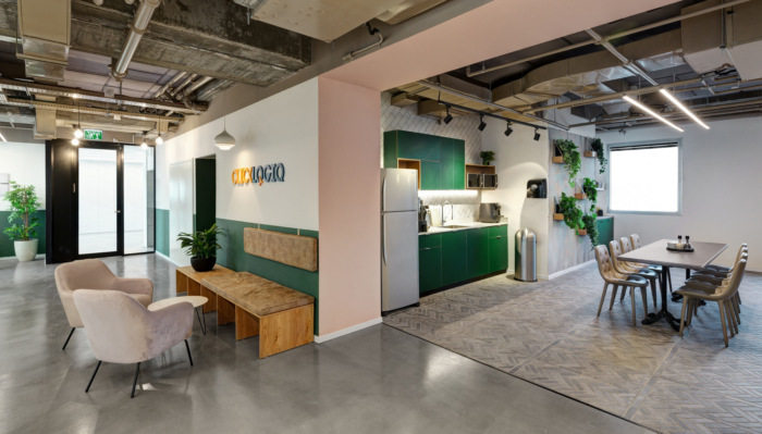 作为一家年轻公司,需要一个宽敞而温馨的聚会区,用于用餐、交谈和公司聚会。入口和厨房区旨在提供多种座位选择,同时使用平静的配色方案和绿色植物,营造出年轻有趣但成熟的氛围。#写字楼设计装修公司#