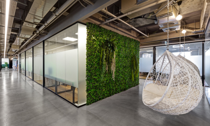 绿色植物再次在空间下方与用户相遇,在办公室之间的通道中,那里有一个秋千的休息点,悬挂在天花板上,面向绿色墙壁。在空间的尽头,设计了一个内置长凳,为那些寻求更私密的隐蔽空间的人提供另一个聚会点。#写字楼设计装修案例#