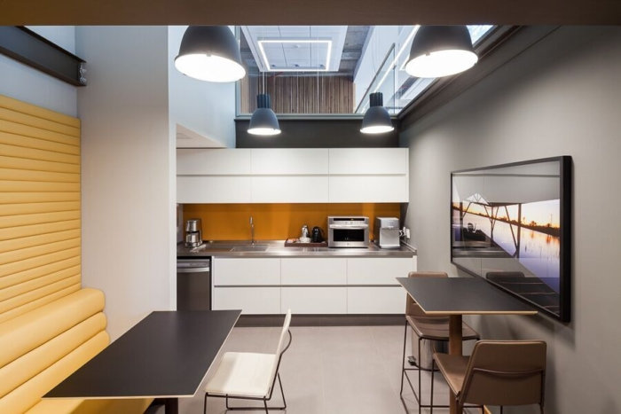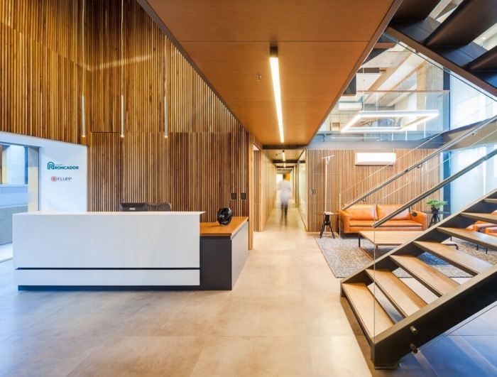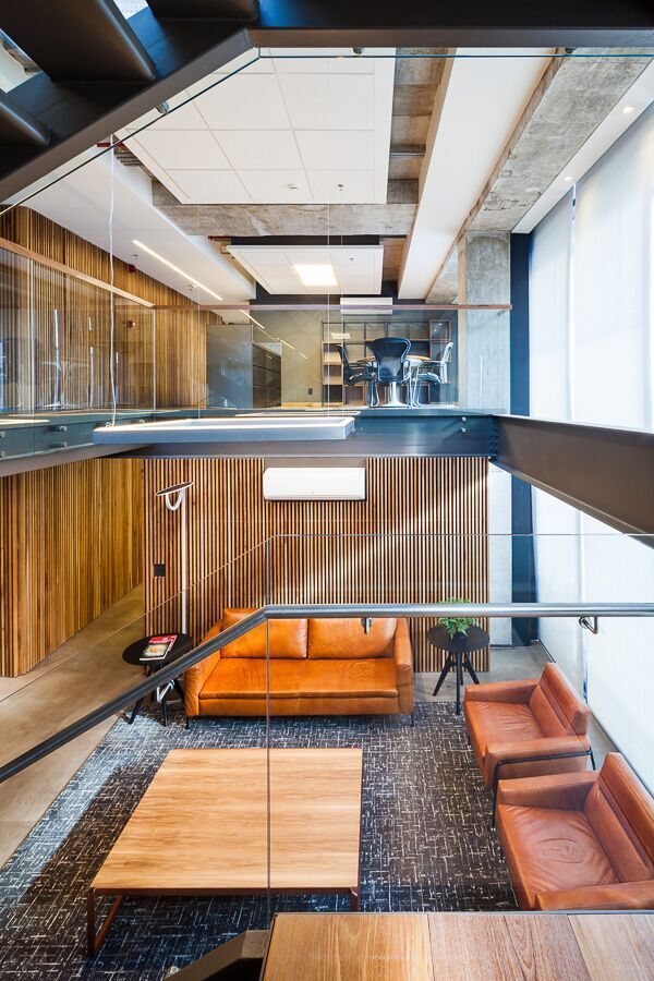 室内设计在墙壁和家具上主要使用木材和皮革,混合了金属建筑元素和暴露在外的混凝土梁、板和柱子。#办公楼装修公司#
