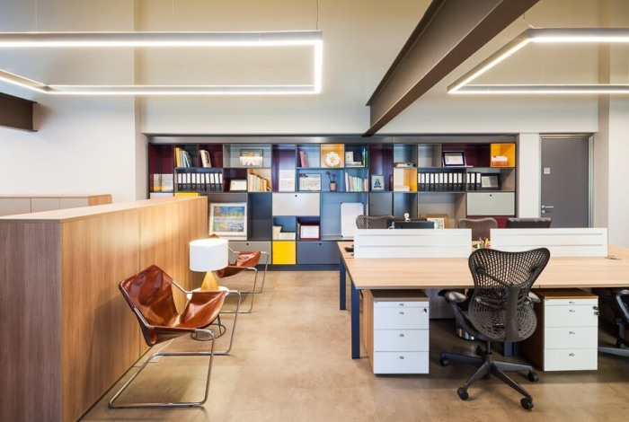 办公楼装修:室内设计在墙壁和家具上主要使用木材和皮革