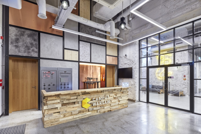主接待台位于大楼的另一端,由回收木板和装饰性接待墙组成,装饰性接待墙带有带 LED 照明控制灯的翻新配电盘,这是前伏特加工厂的遗物。在接待区附近,还有其他设计元素:10米高的天然垂直花园;水磨石地板让人想起 1950 年代和 60 年代使用的地板;一个巨大的美人鱼,在明亮的霓虹灯下点亮了中庭的墙壁。#办公室空间设计方案#