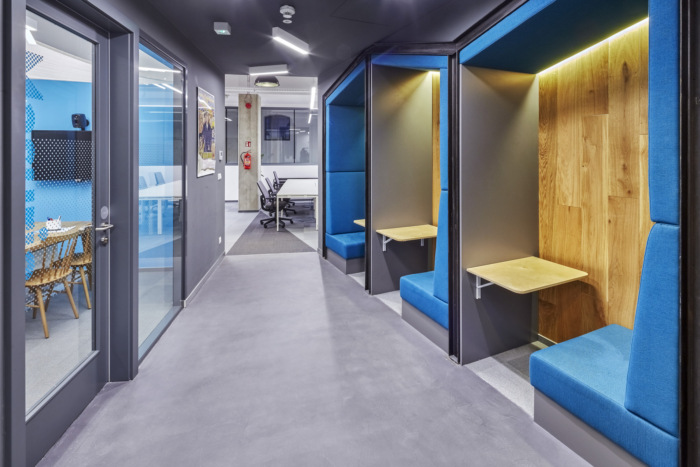 餐厅隔间附近的天花板由回收的不锈钢制成,穿孔用于吸音,与室内设计中使用的其他天然材料和饰面相得益彰,例如木质元素和具有 100 年历史的原始裸露砖墙。餐厅的摊位装饰有战前“Koneser”工厂的图像和波兰历史悠久的伏特加品牌的图案。#办公室空间设计案例#
