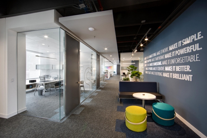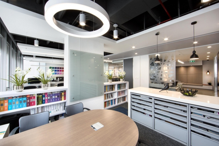 照明设计包括嵌入式灯和书桌上的吊灯。重点装饰落地灯给空间带来舒适感。墙壁大多是白色的,焦点区域是浅灰色或深蓝色,以增强文字或图形的力量。有玻璃隔板,根据标题有超大的字母和文字。#广州办公室装修公司哪家强#