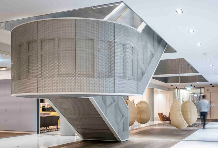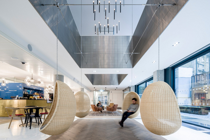 反光钢瓦覆盖了一个中央空隙,由著名工业设计师Ingo Mauer设计的令人惊叹的烛光效果照明照亮,悬挂在一楼的天花板上。每层楼都设有灵活的座椅,设计定制的粉红色皮革展位被包裹在预制混凝土和胡桃木桌子旁边,旁边是数据和电源连接点,为员工提供了“休息”的空间,但仍然可以在办公室内协同工作。#高档办公楼设计装修#