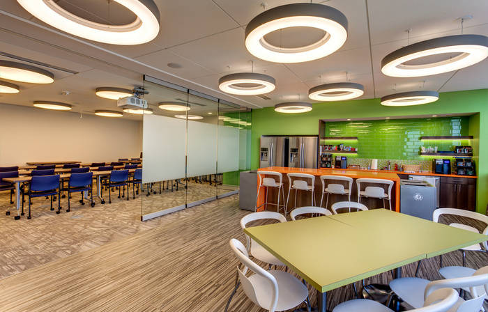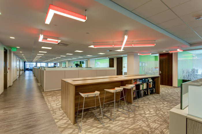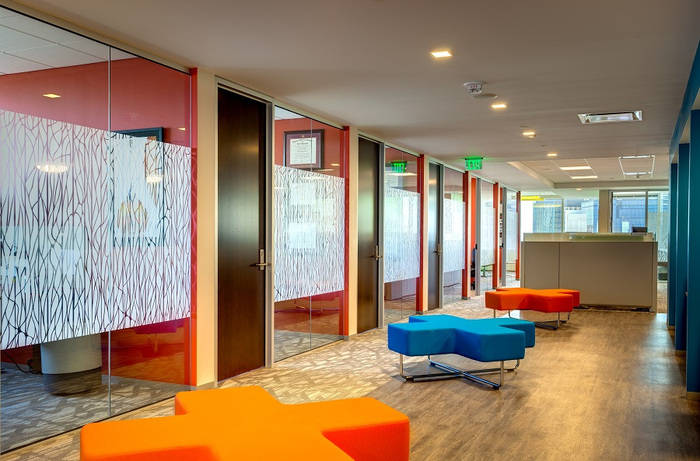 位于空间周边的合作伙伴办公室拥有大面积的玻璃,让自然光能够渗透到开放的办公环境中。颜色强调增加了兴趣,每个地理方向在私人办公室中都有不同的颜色强调墙,图案和形状延续了面料和家具中的数字主题。#广州办公室装修哪家强#