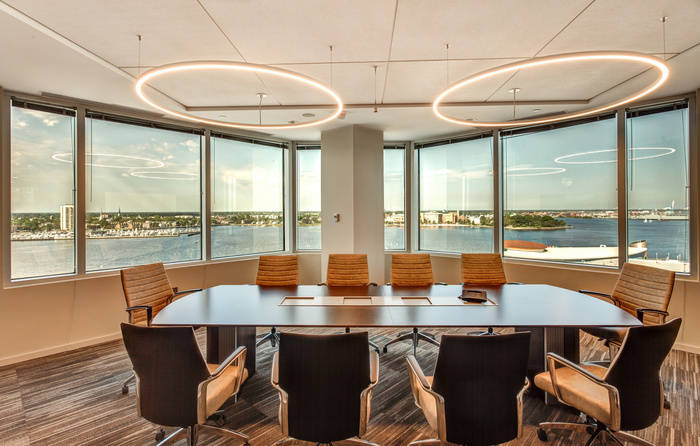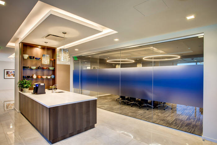 接待台由镶有玻璃的木饰面背板固定,该背板带有定制的蓝色薄膜,让人联想到水。接待台有一个嵌有发光的亚克力面板,上面有数字图像,对面的墙壁上举办了当地画廊的旋转艺术展览。建筑干净、时尚、现代,大堂的灯光很微妙,接待处和大堂休息区的框架是浅色的。#办公室装修效果图#