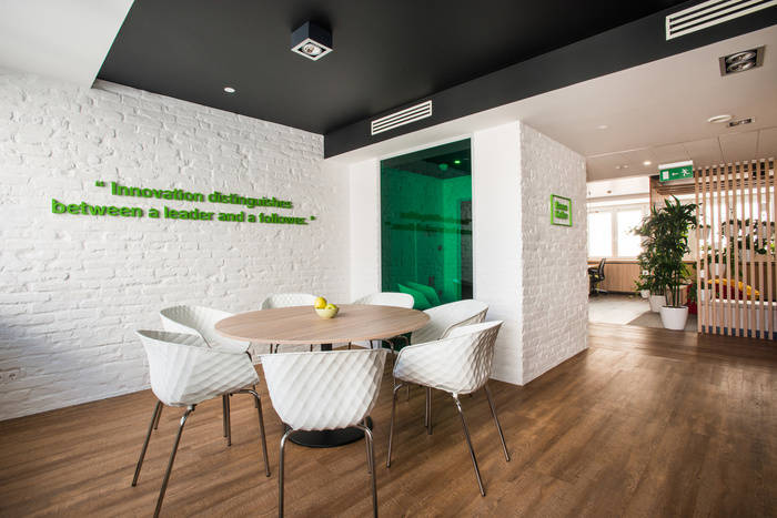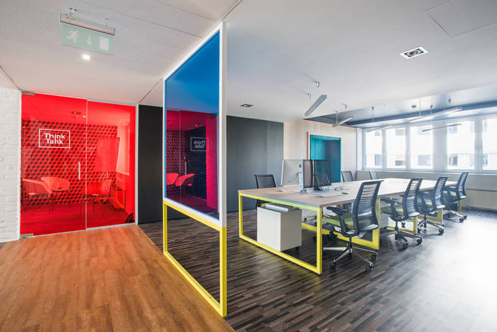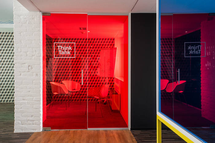 再加上办公室两端带有 3D 图案的瓷砖在大型彩色玻璃表面上的反射,以生动的色彩、开放的空间和绿色的表面。这是对现代办公室的愿景,即“成人游乐场”。#现代办公室装修#