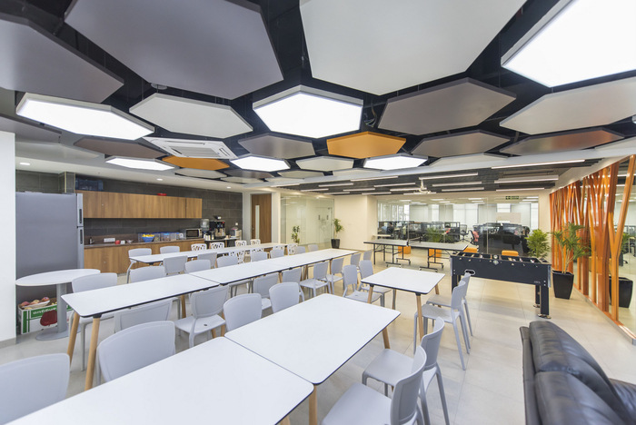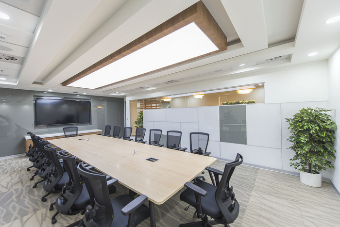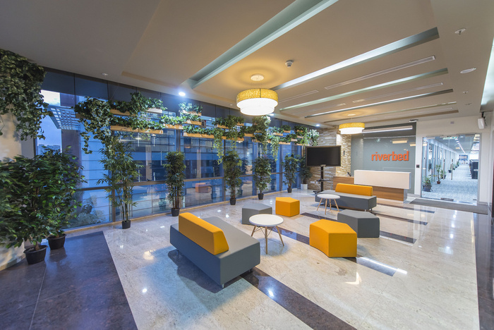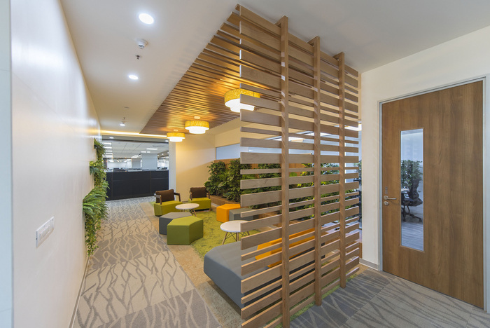 空间设计体现了员工的需求、乐趣、新鲜和活力,以及企业理念的结构。将此设施设置为他们未来扩展的基准。接待处是任何访客的第一次相遇,旨在创造一种影响,它沿着外部玻璃安装天花板悬挂花盆、天然石材饰面柱子和室内植物,创造了一种注重与自然联系的元素的亲生物设计。具有户外景观的工作空间以及包含诸如生活墙、内部水元素等元素的工作空间已被证明可以减轻办公室用户的压力水平。#办公室空间设计案例#