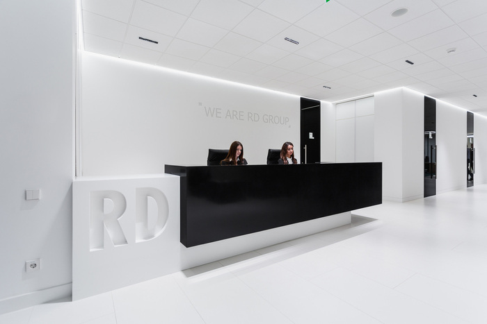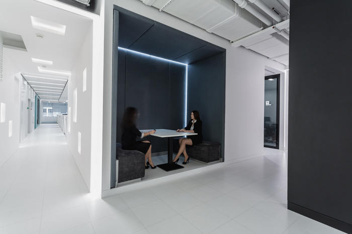 接待区带有媒体屏幕的专栏可以向客户展示公司的项目,包括未来计划的项目。其中一间会议室位于接待区附近,这也突出了现代快节奏公司的形象。全玻璃体量提供全方位的城市景观。体量通过深绿松石色玻璃墙与接待区隔开,这是公司徽标中的强调色。创新——带有隐藏光源的灯、聚合物现浇地板、会议室智能玻璃,可根据隐私要求改变其光学特性,并变得更暗或完全透明。#办公室空间设计公司#