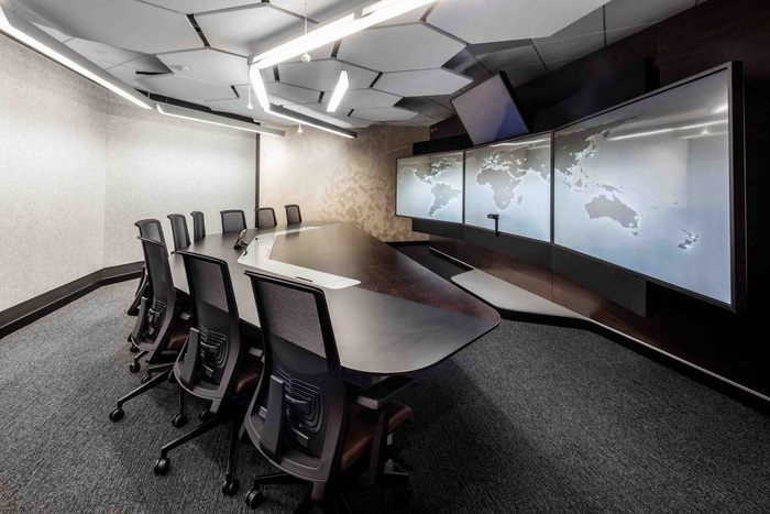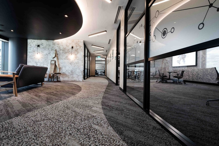 通向青翠的入口,布里斯班周围起伏的山丘和山谷在内部相互转换,郁郁葱葱的绿色植物、浅色的石头和模仿山坡起伏的分层接待台。自然光是空间的一大特色,营造出温暖而令人振奋的氛围,让人联想到城市本身。通过霓虹灯、铜管和城市元素等定制组件的对比,河流与城市景观的关系,鹅卵石般的地毯纹理和颜色反映了布里斯班的河床、水和当地植物群。#企业办公室装修公司#