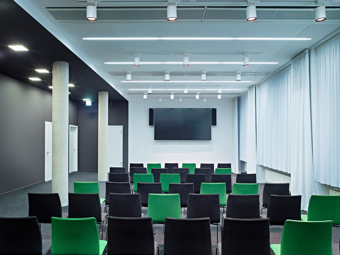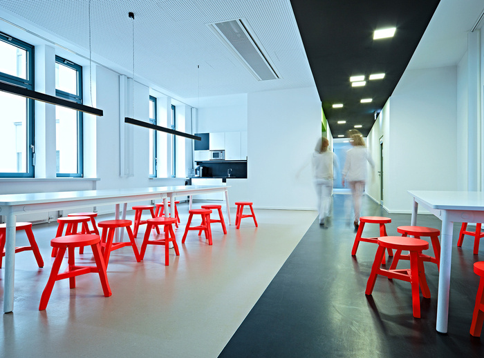 不同的配色方案标识工作区的功能。彩色会议箱作为建筑物中清晰可辨的定位点。每层楼都有特殊的空间,如复印机设施、厨房和站立式办公空间,作为重复出现的颜色点闪闪发光。#办公楼室内设计公司#