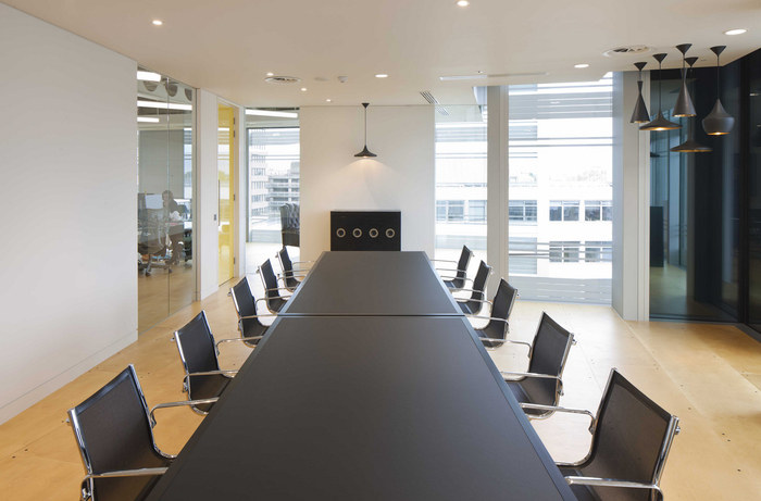 空间分布在三层楼,由办公室的视觉中心主导,这是一个定制的符合人体工程学的楼梯。流畅的清扫台阶逐渐变细到一个大平台,上面点缀着座椅垫,可以欣赏到趋势观看视频墙的美景。#办公空间设计装修#