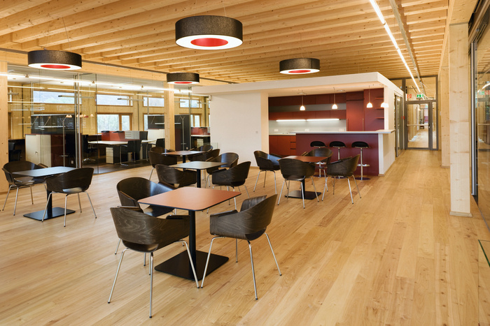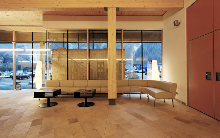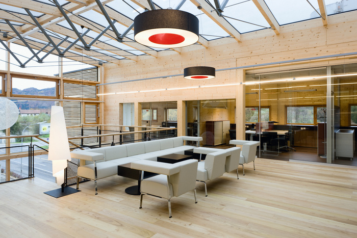 该建筑由带有 M+M 形支撑的稳定木结构构成,悬挂在离地面数米的地方。#广州办公室装修设计# 由玻璃制成的连接结构跨越两层楼,设有门厅和接待区。透明的玻璃立方体打破了80米高木框架的坚固性,融合了它们不同的建筑品质??庞敕獗?、轻与重、玻璃与木材的建筑相互作用体现了当相反的方面相遇时可能发生的创造潜力,就像在积极的企业文化中一样。#广州办公室装修公司#