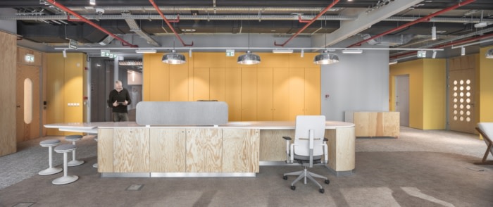 板块被切割,并安装了一个雕塑楼梯,以垂直连接每层楼的社交中心。楼梯是线和织物的隐喻,与街对面可见的历史悠久且享有盛誉的服装厂有关。打孔图案是“机器时代”的国际现代主义常见象征。尽管提到了工业过去和科技未来,但通过使用流线型、友好的形状、天然材料和柔和的色彩,这个地方温暖宜人:天然贴面(松木、白蜡木、橡木)、用于吸音元素的天然羊毛毡,木纤维天花板处理,软木隔音墙。#现代办公室装修案例#