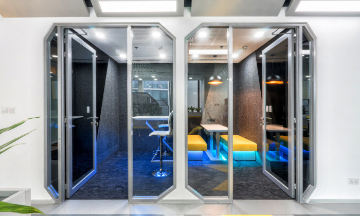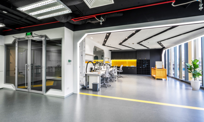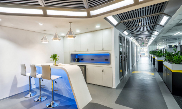 企业实验室采用了其办公室的相同理念,模仿宇宙飞船来传递“没有不可能”的文化。企业的品牌也以标志性的黑黄色家具为特色。实验室拥有现代化的会议室预定系统;所有预订均通过每个会议室前智能板上的直接交互式预订系统执行,并在系统上快速轻松地进行更新。#办公室装饰设计案例#