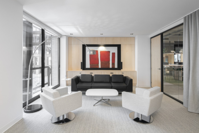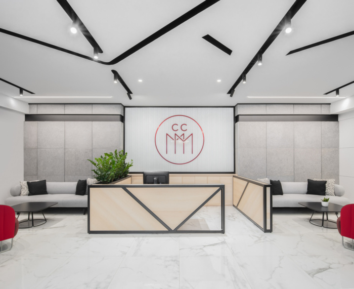 对称的接待处以及悬挂在天花板上的标志自豪地展示了该机构的可达性和存在感。从一开始,这个空间就表达了一种精致、别致和专业的概念。#公司办公室装修案例#