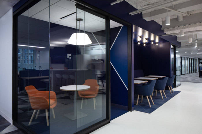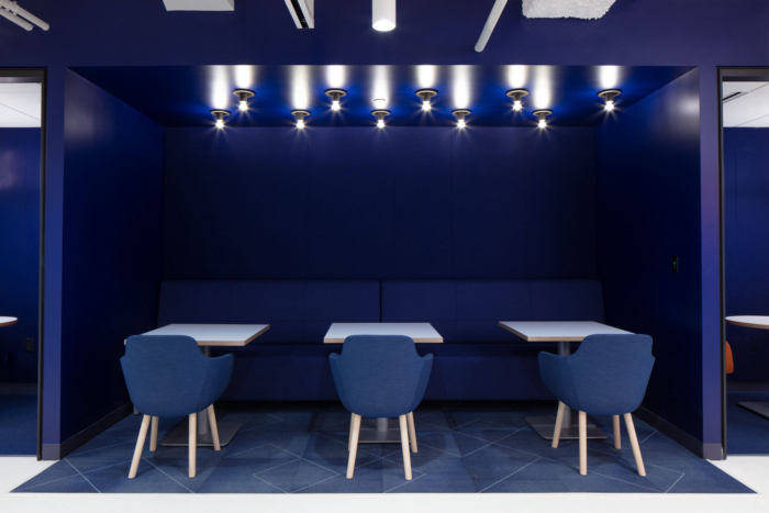 与小型会议室的蓝色墙壁一样,明亮的休息室以深蓝色壁龛固定在右侧,为用餐和会议提供了更加私密的环境。常见的设计元素在咖啡厅休息室中央的白色大岛达到高潮。#公司写字楼设计装修#