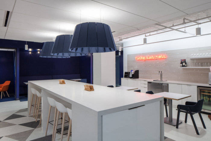 始终忠于几何地毯的选择,三角形图案在岛下方的地板上编织而成。三个超大的蓝色灯罩悬挂在上方的开放式天花板上。在小岛对面,一个橙色的“有风险的商业”霓虹灯在啤酒龙头上闪闪发光——这是一个有趣的最后一击,对公司的名字眨眼。#公司写字楼室内装修#