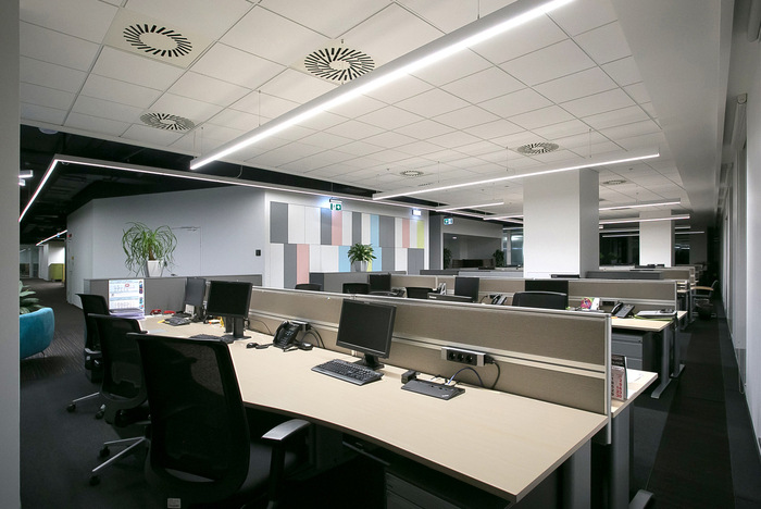 在顶部,建筑师用壮观的天花板照明布置了接待区?;褂懈卟愎芾砣嗽?、律师、金融家和IT领域的办公室。其他部门的员工在下面的楼层工作。他们的工作区是一个带有灰色地毯和白色天花板的开放空间。#办公室设计装修公司#