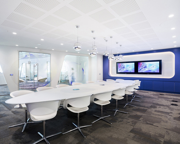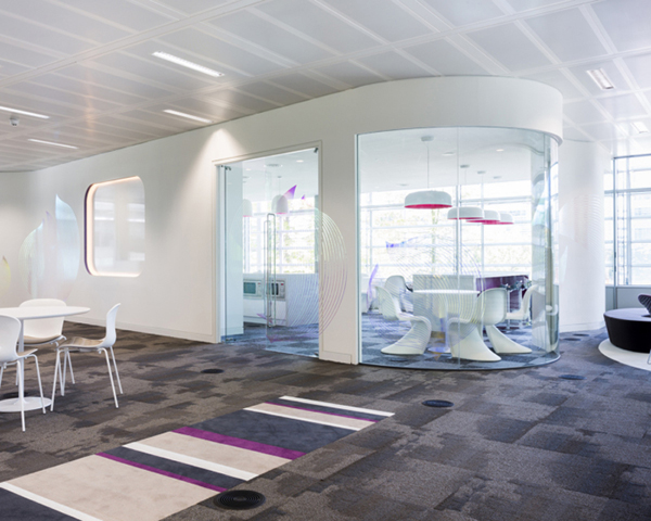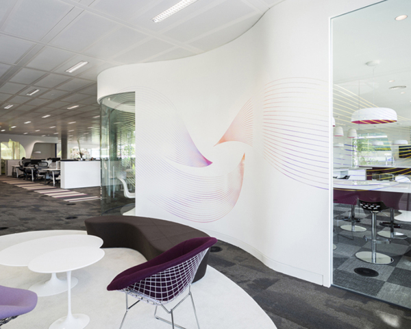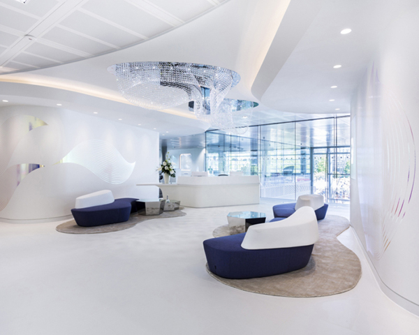 颜色在设计如何为品牌形成强烈的“感觉”方面也起着重要作用。虽然主要是白色,但通过精选的家具和地毯,调色板充满了紫蓝色和粉红色。应用于弯曲墙壁部分的图形薄膜又增添了另一种类似于水晶棱镜效果的色彩。#办公室装修设计效果#