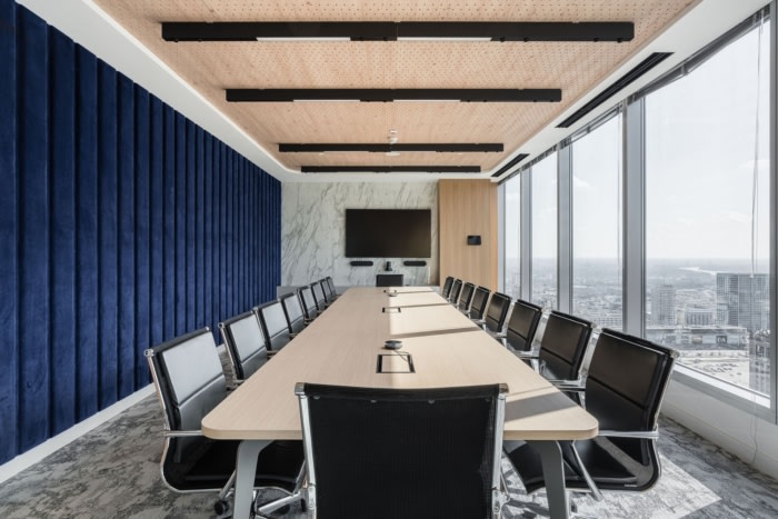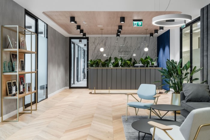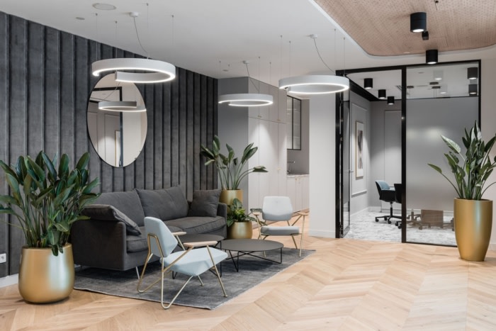 办公室的内部以独特的方式设计。在这里,有多种材料的组合,例如石英烧结、丝绒、叶片或 Lastico。颜色的选择使室内看起来舒适,可以看出整体性。细节是这个项目最重要的部分,整个空间都充满了它们。由于最终效果以及真正高水平的实现,它们中的大多数值得我们关注。#写字楼办公室装修#