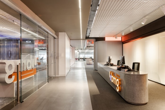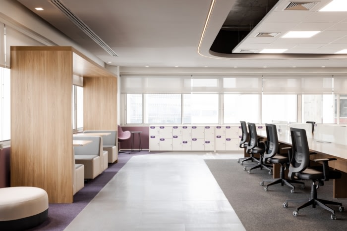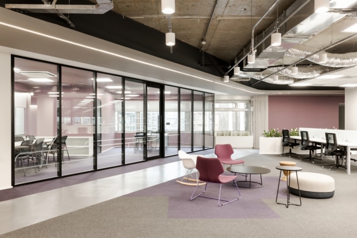 这座建于1984年的标志性野兽派建筑保留了一些原有特色,在工业风格和现代风格之间取得了平衡。挑战在于将建筑物的功能与客户的需求相结合。数字存在出现在入口大厅,两个36米长的数字面板穿过大礼堂,为所有员工带来信息,LED 面板和感官照明系统补充了这一概念。#办公楼室内装修风格#