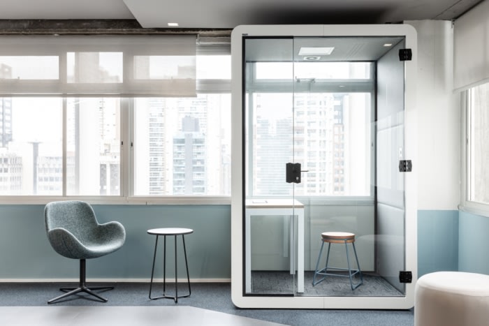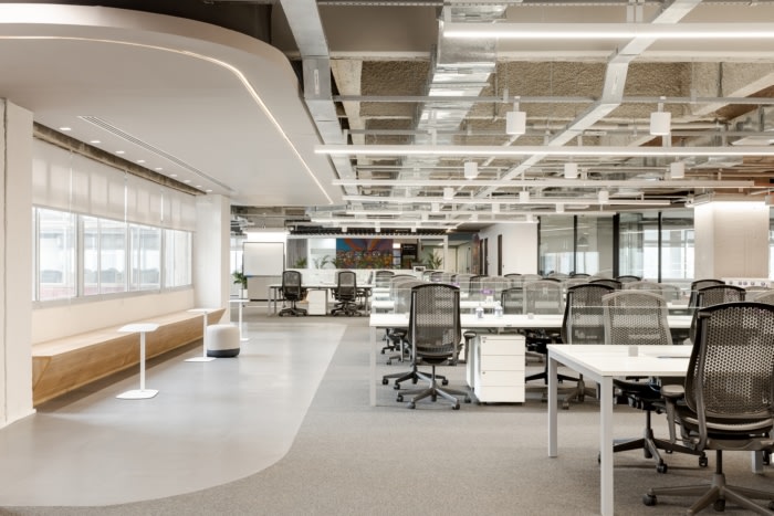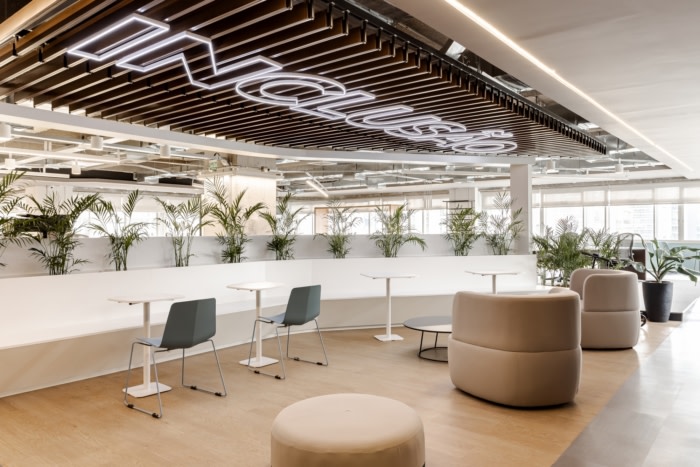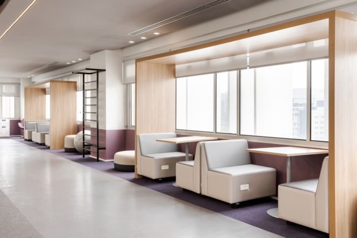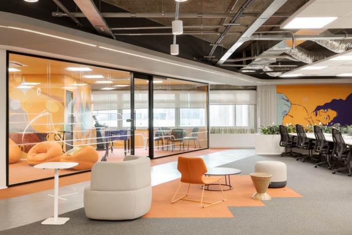 最后,还有一个元素是为了鼓励员工的健康,不仅是身体上的,还有精神上的。一条长约230米的跑道暗示了城市概念,并鼓励人们在办公室内移动,从而相互了解。在天花板上,设计师的想法是创造一个灵活的、季节性的艺术空间,涂鸦艺术家的绘画就像一场展览一样变化,将城市艺术带入工作环境。#办公楼室内装修案例#