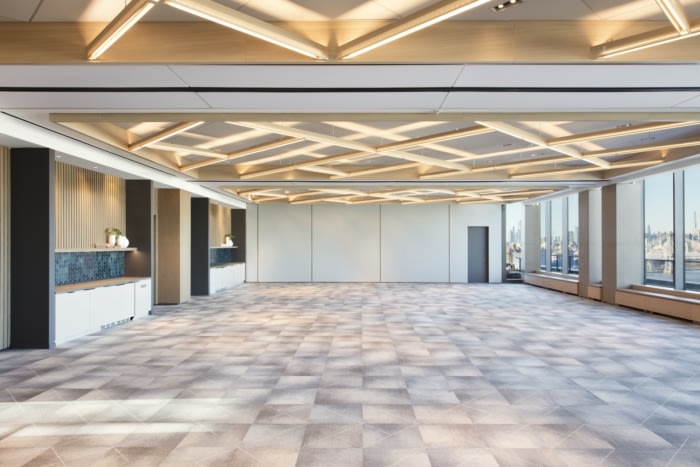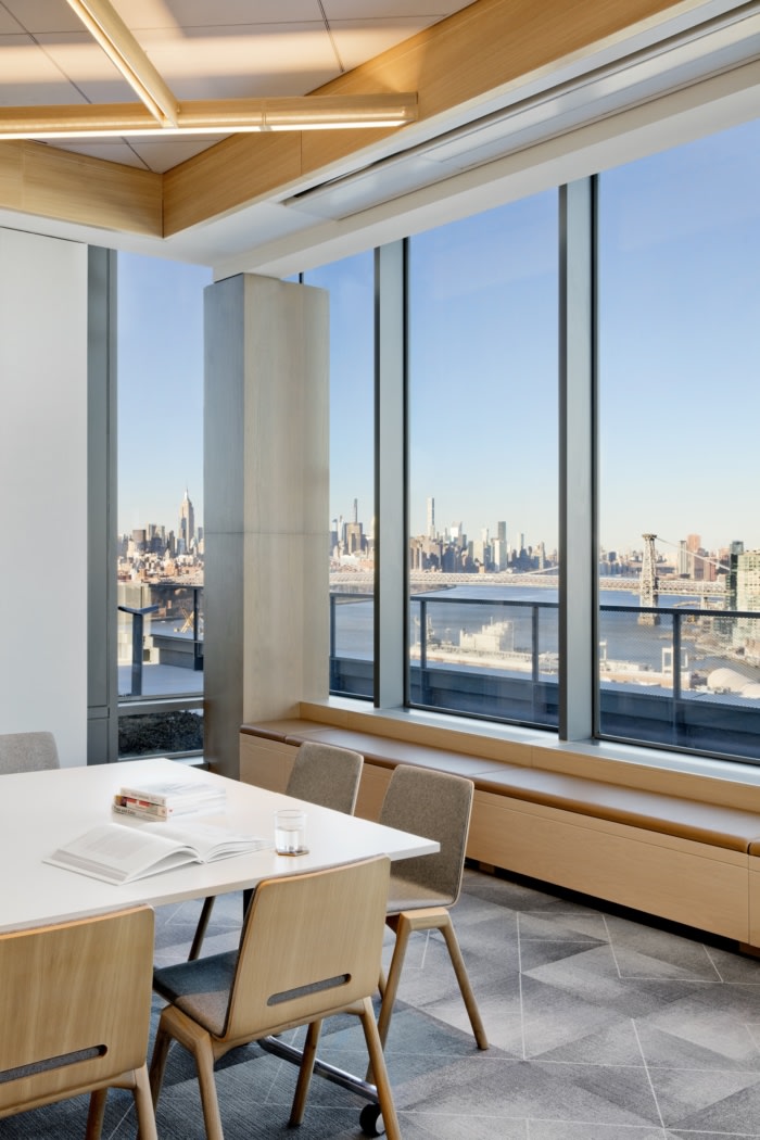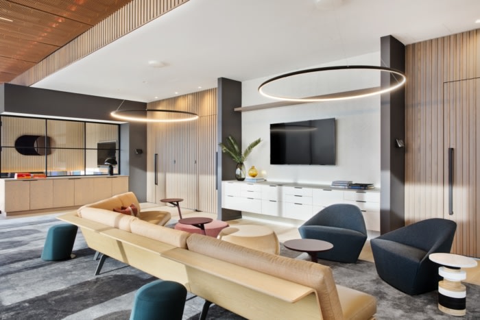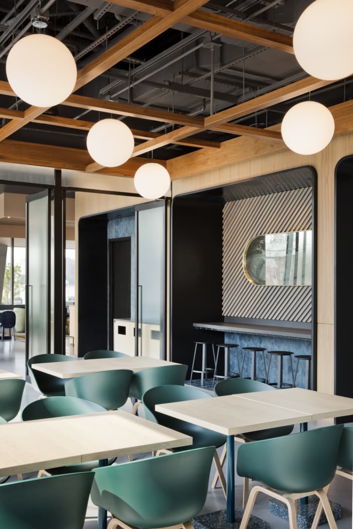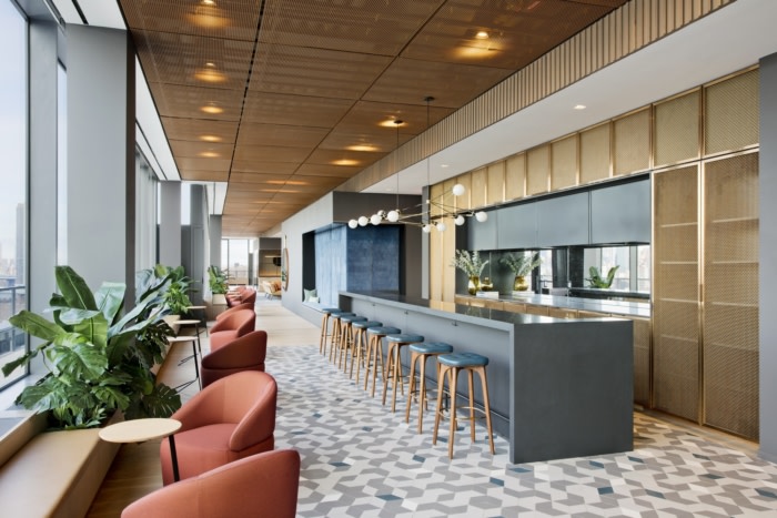 从老式游艇的概念中汲取灵感,融合了更丰富和更深的温暖木材调色板和黄铜网天花板,在16楼营造了一种温馨的氛围。室内使用定制家具和复古家具,反映了使用这个工作空间的新兴创意。#办公楼设计公司#