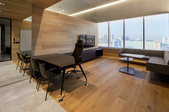 随着材料的变化,我们瞥见了行政空间,地板、墙壁和天花板都被木头覆盖,以保持视觉的流动性和深度,通过使用带有镜子和玻璃的矮墙来强调这一点。高度的变化赋予了不同空间的层次感。#广州办公室装修公司#