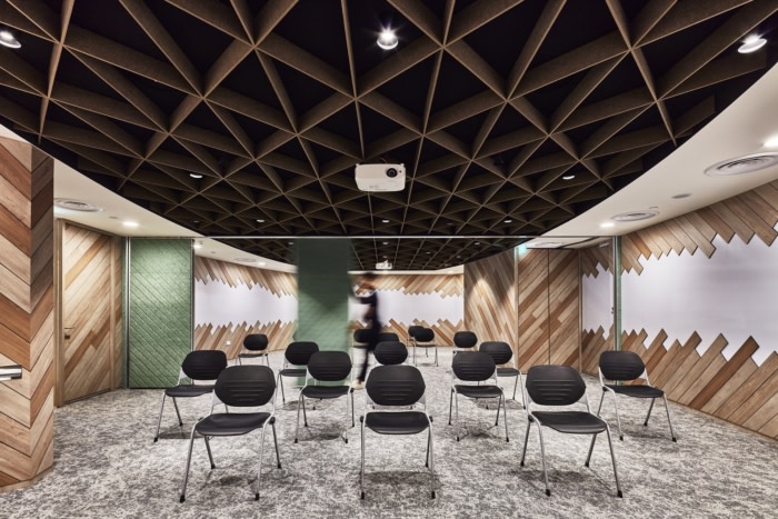 使用柔和的灯光和让人联想到绿色植物和水体的设计元素营造出舒缓舒适的环境。通过使用可操作的墙壁,可以将两个培训室结合起来以容纳更大容量的活动。受树木象征意义的启发,弯曲的墙壁覆盖着木板和格子,构成了空间。两个房间都配备了视听功能和可书写的表面,以促进学习和讨论。#广州办公室装修公司#