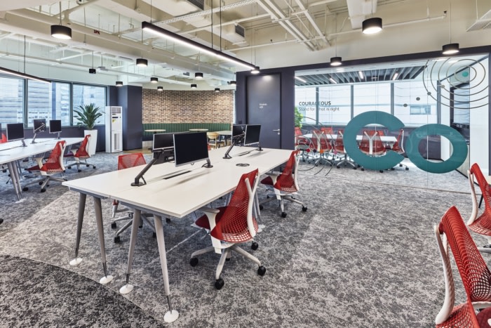 协作和娱乐空间的口袋也散布在整个工作站中。沿着地板核心的工作站的曲线放置有助于描绘用户走道,而通过渐变色调的地毯巧妙地结合了寻路。#广州办公室装修设计#