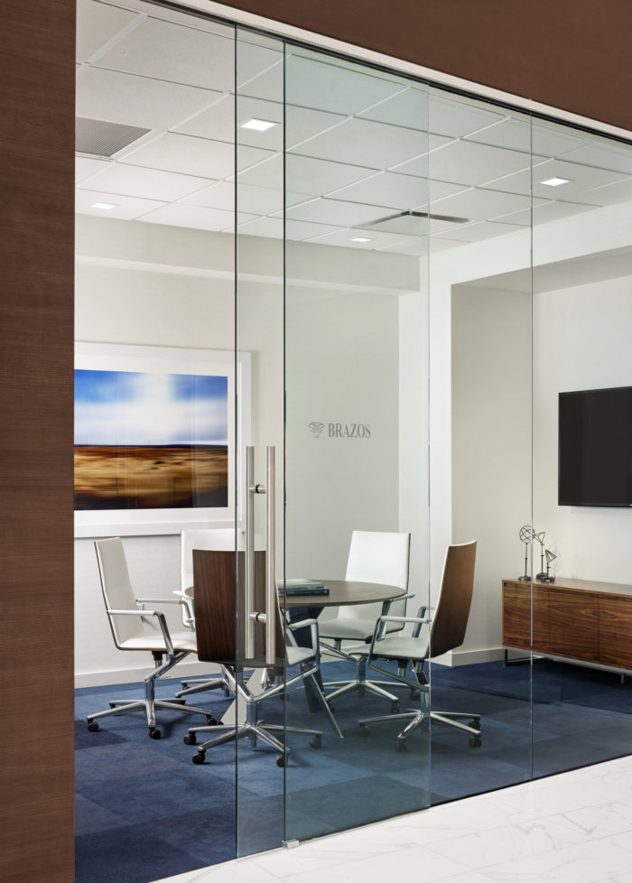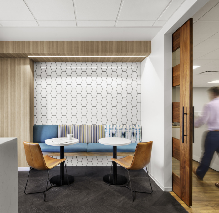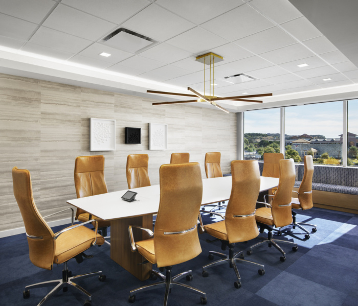 整个办公室都是玻璃正面,让充足的日光进入空间,温暖的木门和玻璃镶嵌,深蓝色的地毯为开放式办公室增添了品牌和色彩。有意设计的照明和控制装置可让您的工作日更加舒适和高效。微妙的品牌通过饰面、艺术品和家具贯穿整个空间。#办公室装修设计公司#