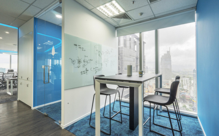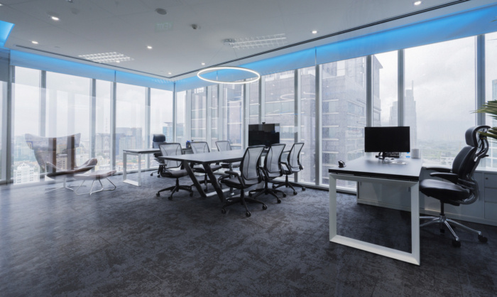 办公室应在吸引和留住人才的同时,体现透明、信任和现代的品质。透明、信任和现代性的品质被材料的组合所强烈注入。接待区和大堂的白色大理石与办公室的玻璃面板相得益彰,代表了金融科技企业核心的反射、透明和清晰的价值观。此外,办公室本身通过灯光、玻璃和蓝色灯光线系统呈现品牌标识,呈现出企业的典型特征。#办公室设计装修公司#