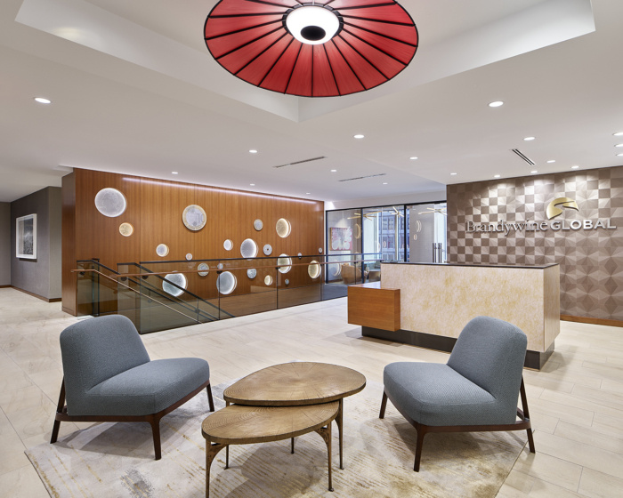 客人直接进入接待和等候区,那里有一面定制的木饰面“硬币”墙,延伸到空间的所有三层楼,63枚木雕硬币代表了公司开展业务的各个国家。#办公室空间设计#