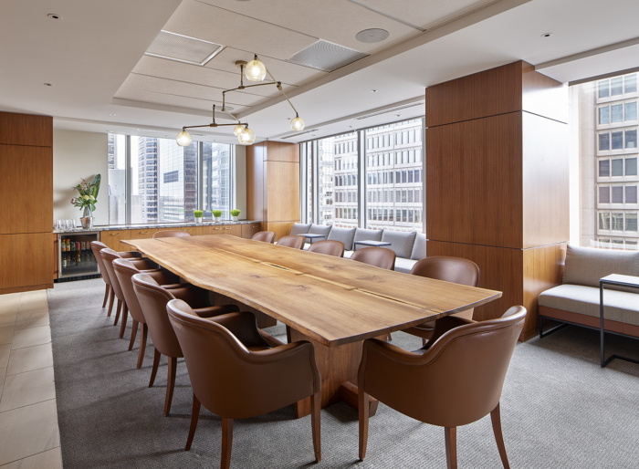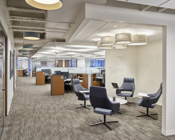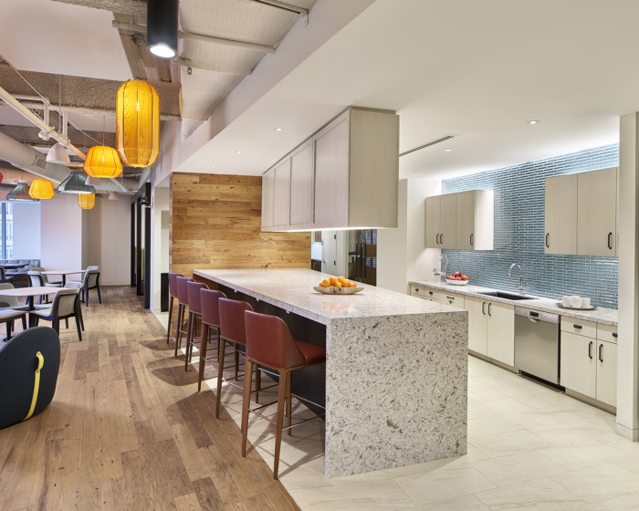 位于费城人口稠密地区的一栋高层建筑内构成了一项独特的挑战,周围的建筑物在一天中的不同时间投下阴影,影响了办公空间通常接收的自然光。为了克服这个问题,设计团队将天花板暴露出来并将其漆成白色,使用间接 LED 灯具照亮空间,同时也有助于减少眩光。#办公室空间设计公司#