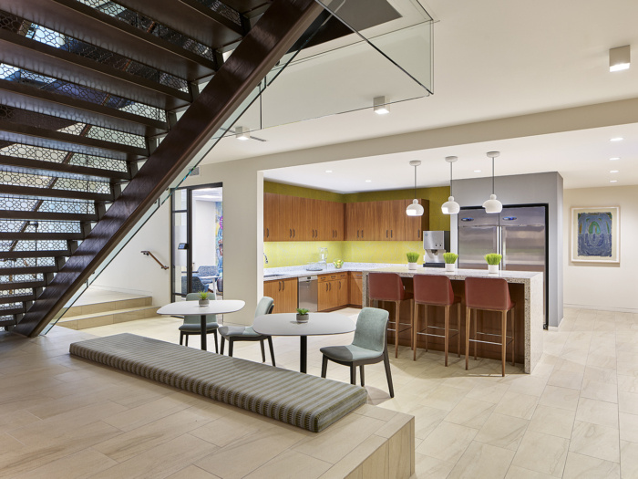 为了增加办公室周围的流动性并鼓励以活动为基础的工作,靠近窗户的两人摊位、带有监视器、农场桌子、休息室和酒吧座位的更大的六人摊位占据了中心聚集点。裸露的天花板、手工制作的木质灯具和回收的栗色地板营造出温暖而有机的书房氛围。#办公室空间设计案例#