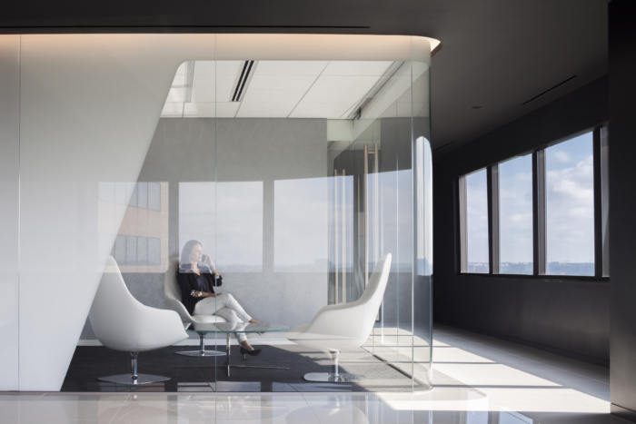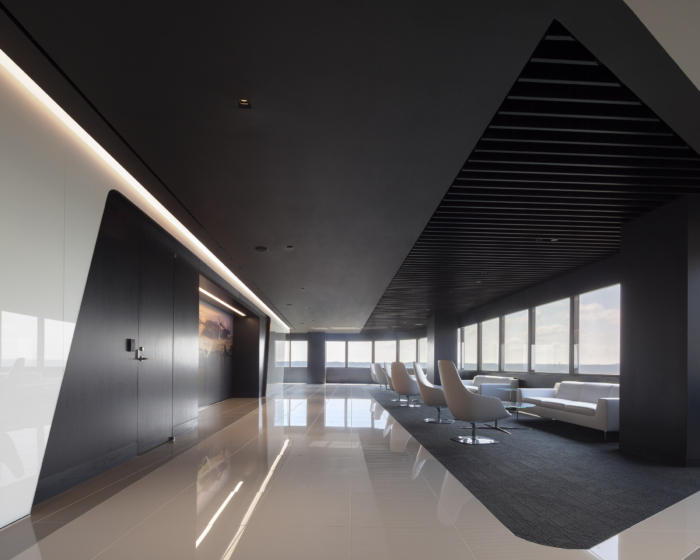 空间中更传统的办公室部分是分配和未分配的办公室和工作站的混合,因为该组织的其他成员通常从总部和其他地点在城里。用于展示该组织处于技术前沿的材料之一是使用曲面玻璃(透明和黑色涂漆)。它的雕塑质量让人联想到垂直升降飞机的一部分,并展示了材料的创造性使用。#广州办公室装修案例#