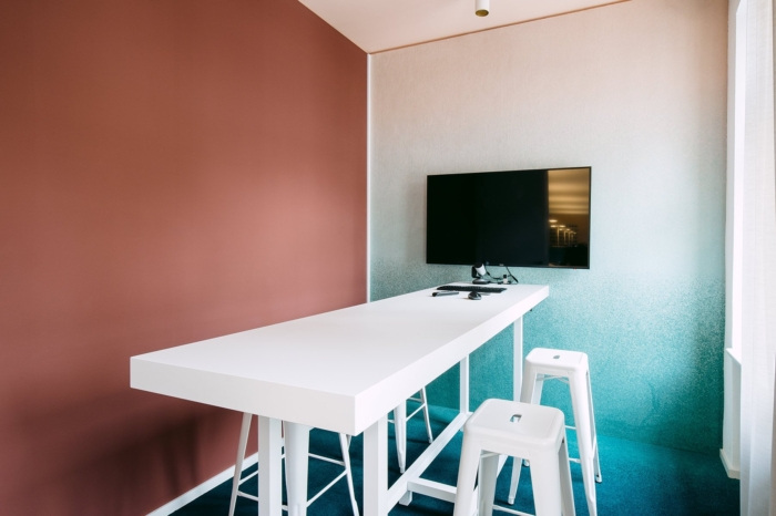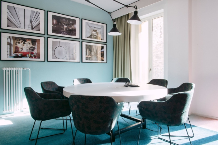强烈、充满活力的配色方案构成了空间,并赋予办公室独特的魅力。橡木地板上铺有深蓝色地毯,工作区的蓝色和绿松石色墙壁立即脱颖而出。#办公室装修公司#