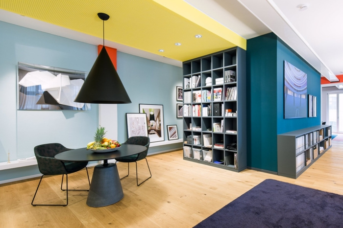 由于色彩浓烈,工作室提供了一种轻松且几乎像家一样的氛围。带图片的餐具柜、被大灯罩遮蔽的舒适休息区和波浪状的窗帘百叶窗,为办公室增添了愉悦的感觉。#办公室装饰公司#