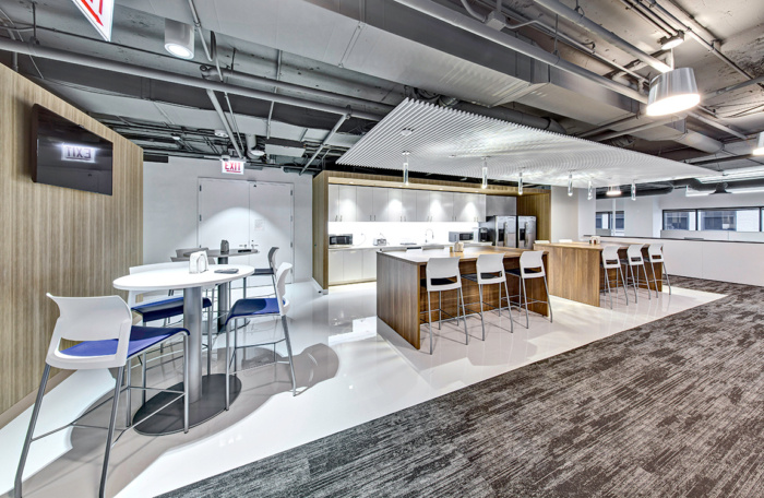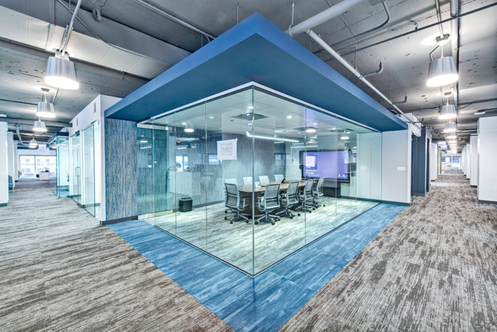 定制设计元素为公司产品创造了引人注目的焦点,与姐妹空间保持同步。多个玻璃特色墙上的浮动木制品箱自豪地展示了客户的产品。在行政会议室宽敞的木制入口处,同样的细节也被更大规模地融入其中。#办公室装修设计公司#