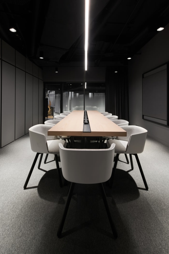办公室设计理念基于将空间划分为两个对比鲜明的区域:工作区块朴素、透明、先进、轻巧;公共空间单元格格不入,杂乱无章,紧凑,引人注目。创造极简主义内部的最大挑战是广泛的公用设施和大量结构元素,以及作为鲁洛三角形的一部分执行的非标准布局。